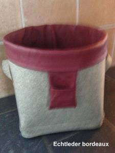 Rund auf Eckig, Größe M Leder in bordeaux, Wollfilz graubraun Gesamtpreis 149 Euro |